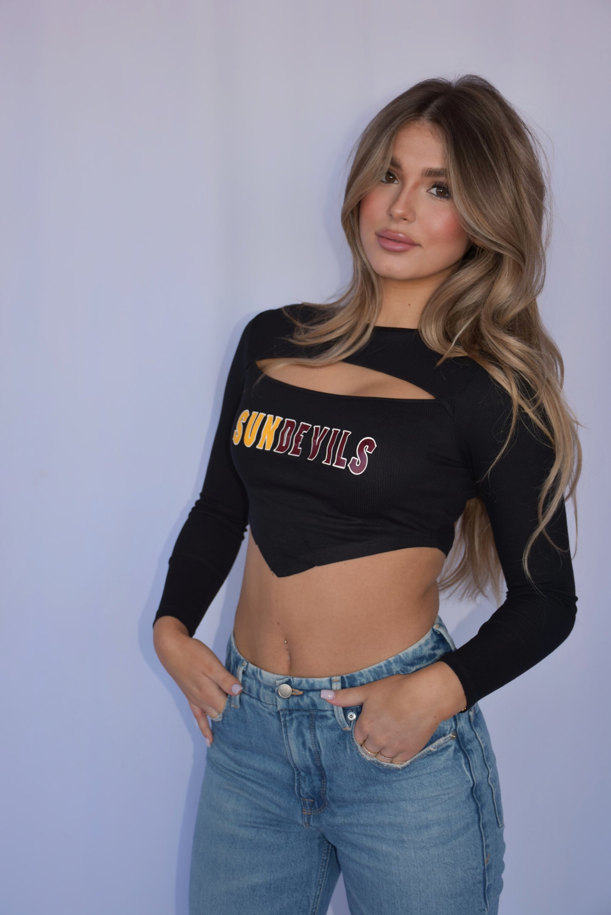 Add some chic vibes to your next game day. Featuring a cotton rayon spandex material in a cropped length and chest slit design. Style with wide-leg jeans, gold accessories and cute sneakers for a look we love.